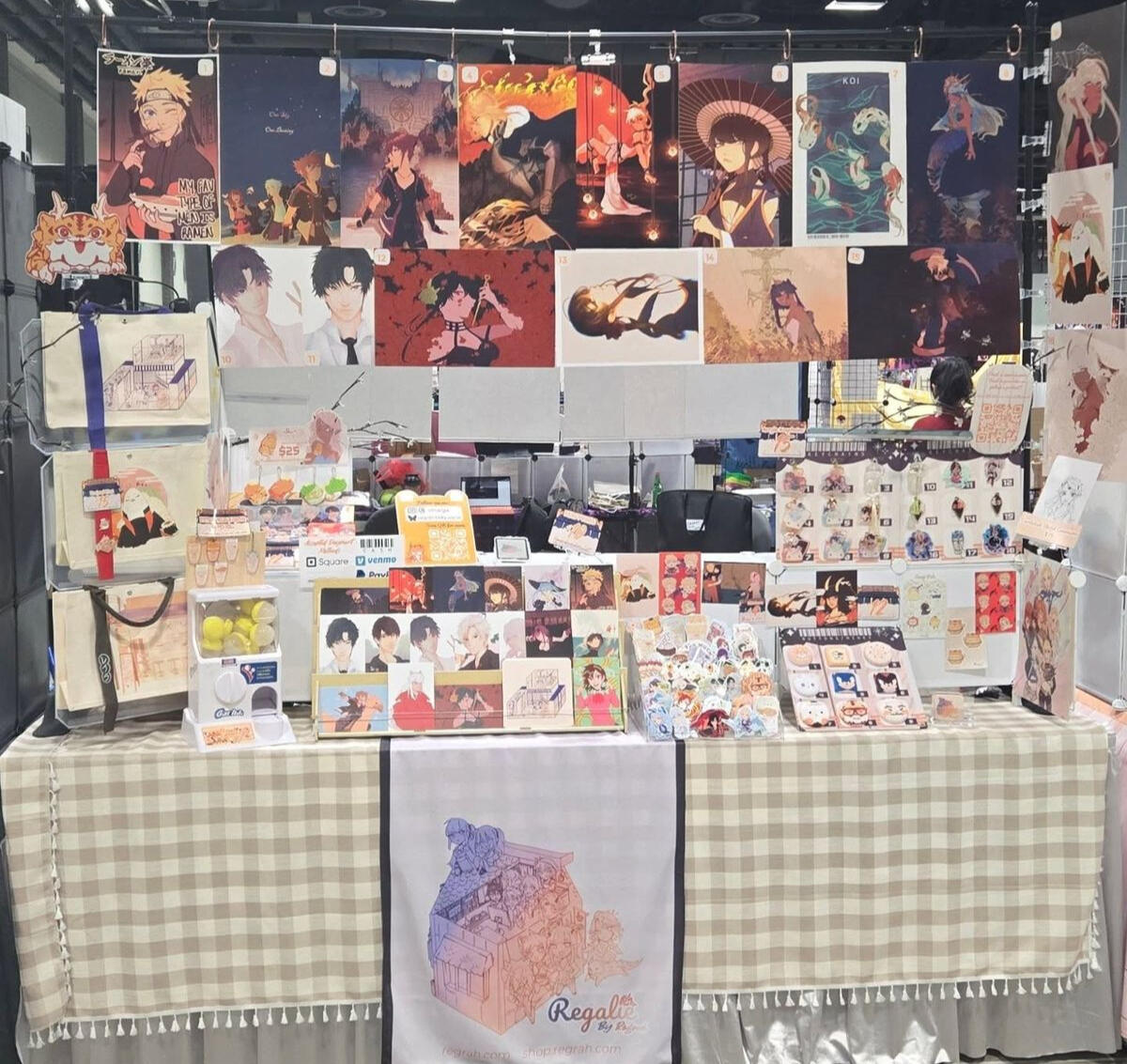 Regalie is a sole-proprietor anime art business dedicated to make acrylic keychains, pins, stationary, and apparel based Japanese art, culture and design. Below are some examples of my table setups.